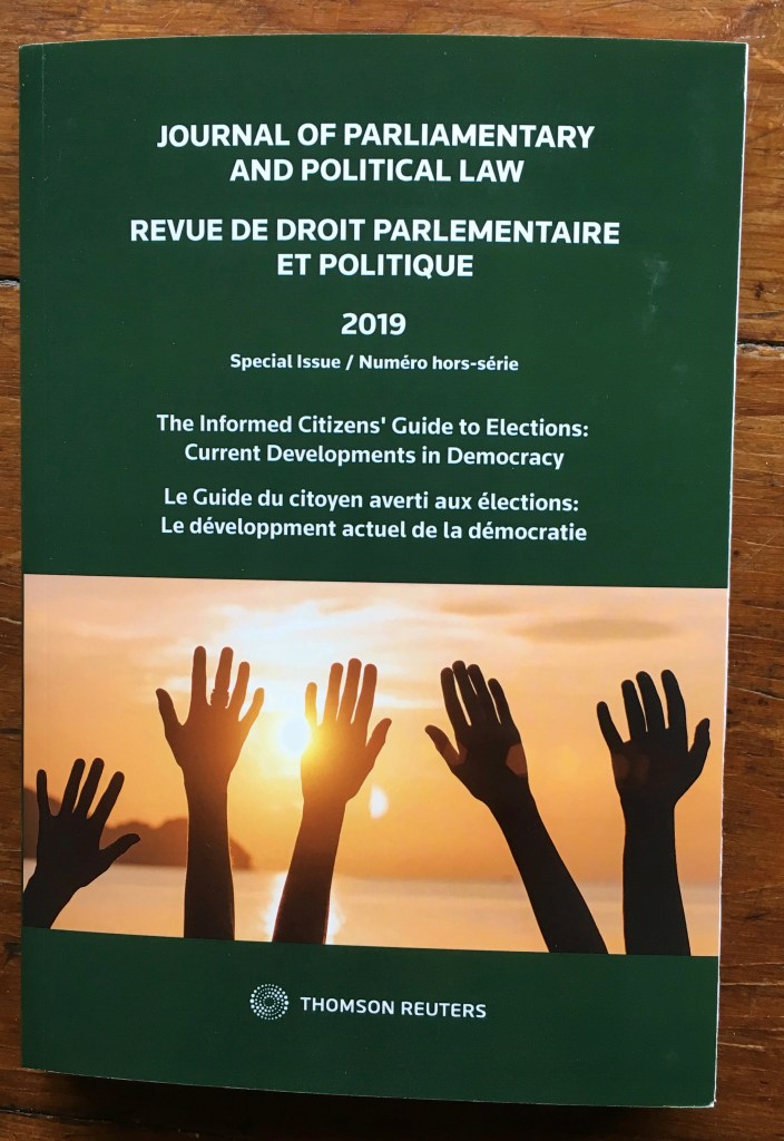 I’m happy to be one of the contributors to The Informed Citizen’s Guide to Elections: Current Developments in Democracy, a very timely issue of the Journal of Parliamentary and Political Law. I can’t wait to dig into chapters from the chief electoral officers for Canada, British Columbia, New Brunswick and Ontario; from leading academics in Canadian electoral law and politics, such as Mike Pal and Elizabeth Dubois of the University of Ottawa and Colin Bennett atC the University of Victoria; and from some newer voices in this area, like Brian Budd and Anna Reepschlager.